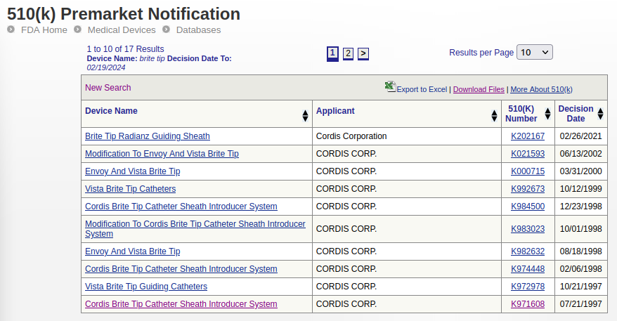 - 如果有多个结果,网站会显示一个表格,其中包含每个 510k